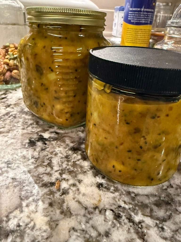I made Solomon’s sweet mango pickle, with a little tweak here and there to try to emulate Chandra’s flavorings, adding some nigella seeds, for example, and a little more sugar, while keeping it fruit forward, as they say these days.