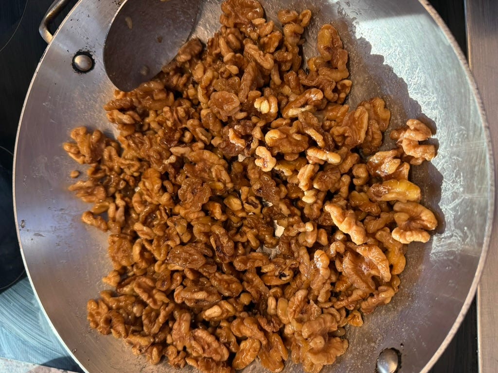 Editor’s Note: I’ll be using these nuts as a garnish for a salad of persimmon, pomegranate, chicories, sumac, and preserved lemon at my pop-up dinner tomorrow, Thursday, December 18, 2025, at Wolf Tree in White River Junction. Please come by and give them a try.