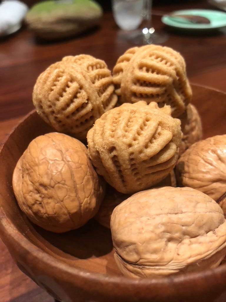 That said, you might not immediately associate walnuts with Chinese food. And yet, among the most delicious and beguiling walnuts I’ve ever eaten were served as a sort of mignardise at a fine restaurant in Shanghai. After an exquisite meal in a private dining room at Fu He Hui, a bowl of warm walnut cookies and walnuts in the shell arrived. To our surprise when we cracked open the shells, the nuts had been infused with a rich, buttery vanilla flavor. While we westerners puzzled over how they managed to get that flavor inside, the Chinese we were with waxed nostalgic for this childhood treat. Go figure.