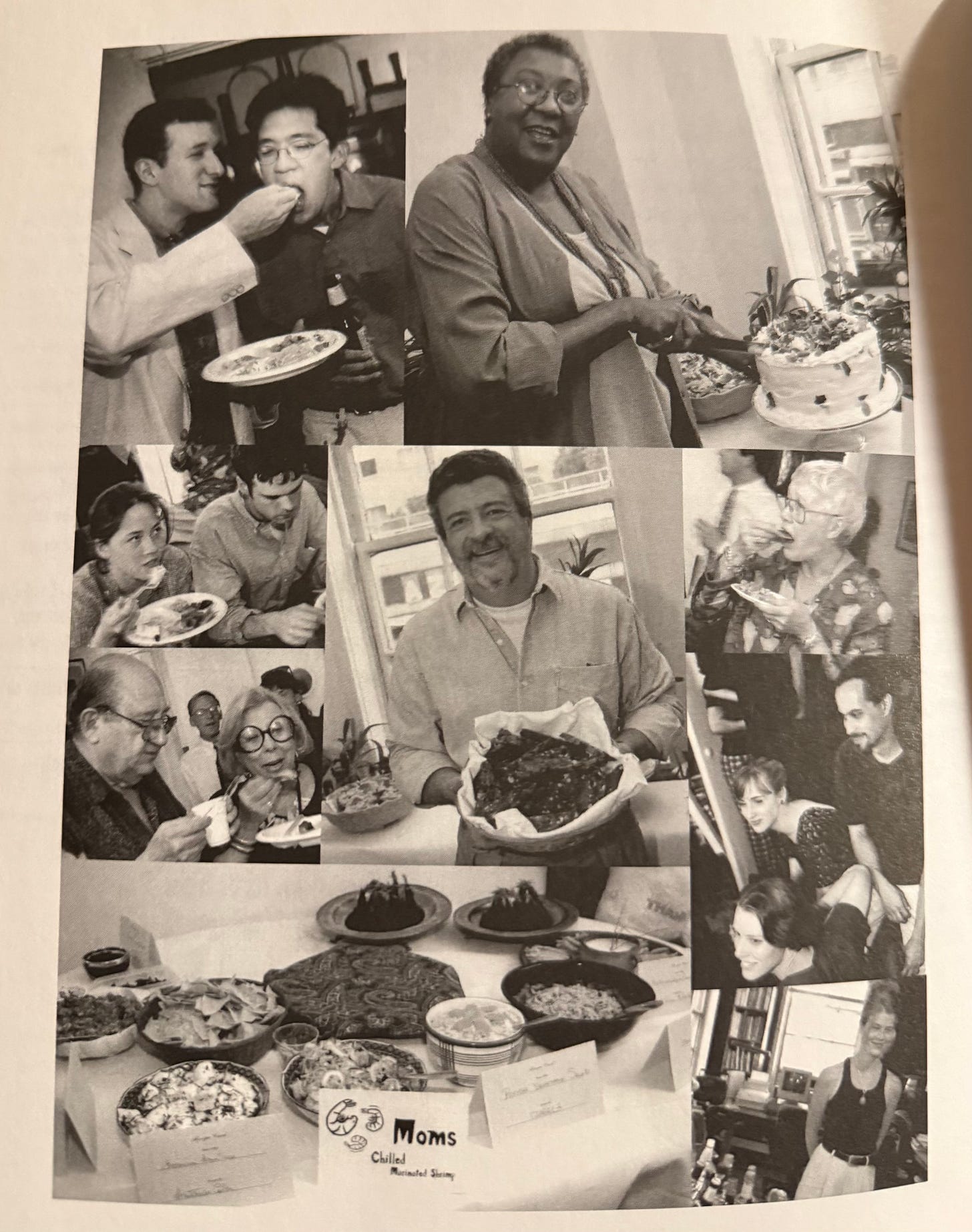 Later, we hosted a giant potluck in that apartment to kickstart the creation of my first cookbook, Cook Something, an invitation for GenX to get in the kitchen and cook. For the party, Eveylnne prepared a five-pound batch of her famous pickled shrimp and produced a stunning savory hors d’oeuvres cake comprised of brioche layered with smoked salmon, caviar, and smoked chicken, that she decorated with whipped cream cheese to look like a wedding cake. Victoria Spencer reviewed the party and Amanda Hesser reviewed the book, both favorably for the New York Times.